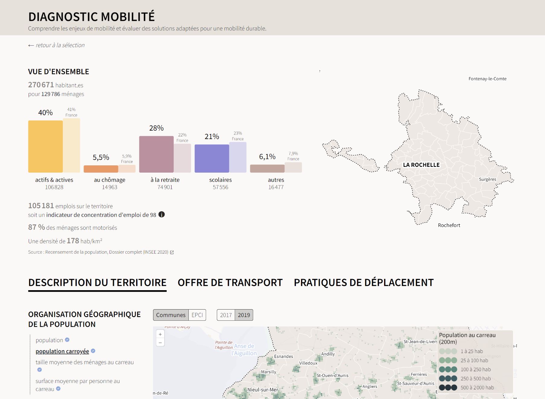 L'outil en ligne diagnostic mobilité permet de comprendre finement les enjeux de mobilité d'un territoire en rassemblant différentes sources de données sur l'organisation géographique d'un territoire, son profil, l'offre de transport actuelle et les pratiques de déplacement.