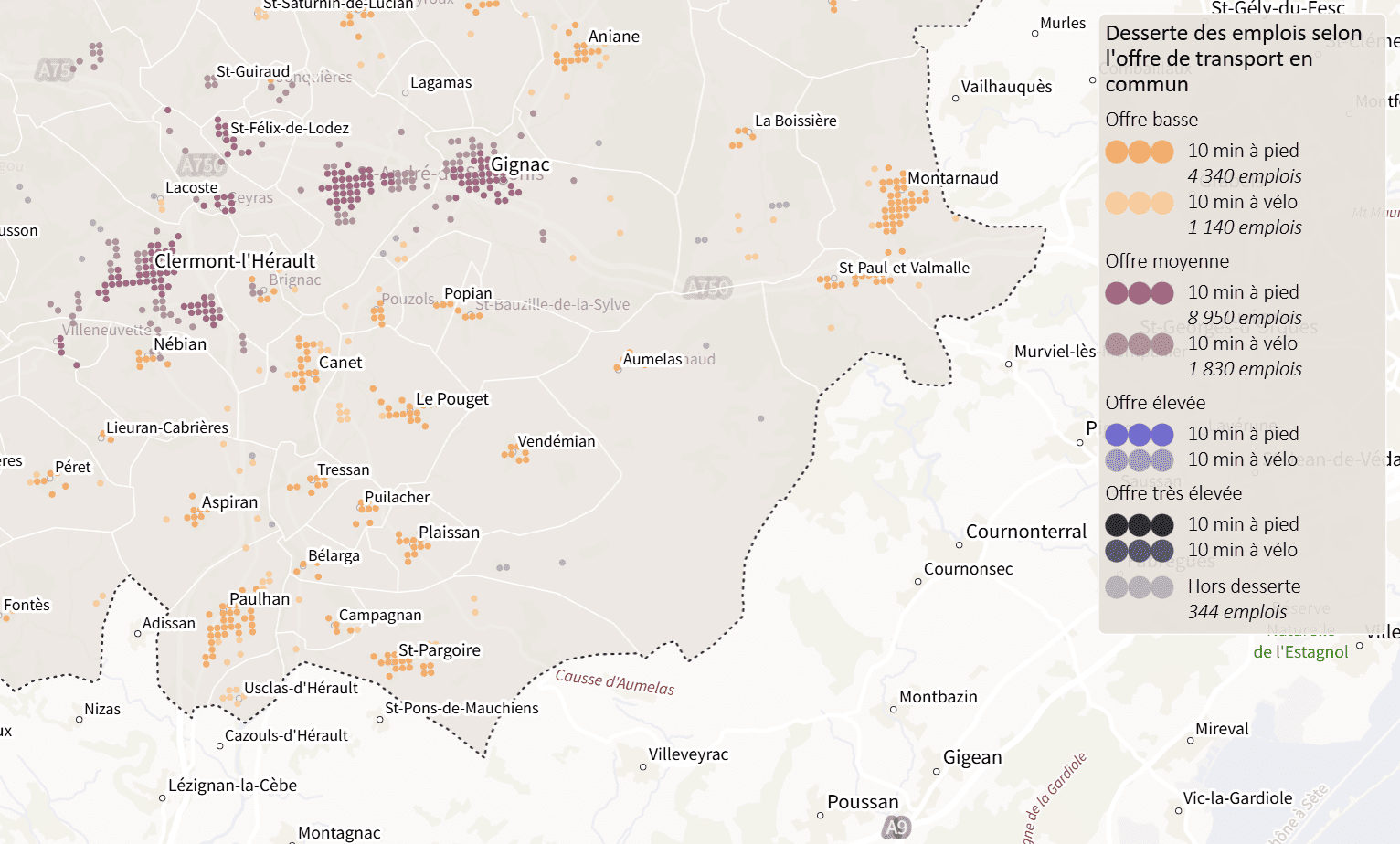 Il est alors possible d'obtenir des analyses de la proximité, de la desserte des transports en commun selon le niveau de service, des flux domicile-travail par modes ou d'autres...
